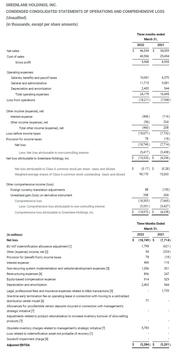 Gross profit was $6.0 million, or 12.8% of net sales in Q1 2022, compared to $8.6 million, or 25.2% of net sales in Q1 2021. Excluding inventory write-offs of damaged and obsolete inventory for Q1 2022 and Q1 2021 of $5.8 million and $1.0 million, respectively, which were associated with post-merger and ongoing product rationalization initiatives, adjusted gross margins (see notes below regarding “Use of Non-GAAP Financial Measures” and “Adjusted Gross Margin” for further discussion of this and other non-GAAP measures included in this earnings release) decreased to 25.3% for Q1 2022, compared to 28.1% for the same period in 2021. The decrease in gross margin is related to an increase in lower margin KushCo-related sales and a decrease in Greenlane Brands sales, which carry a higher margin profile than third-party brand sales with a lower margin profile.