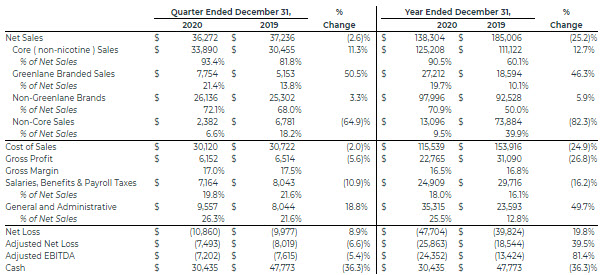 Q4 2020 net sales decreased 2.6% to $36.3 compared to $37.2 million in Q4 2019, and FY 2020 decreased 25.2% to $138.3 million compared to $185.0 million in FY 2019. The decrease in sales during FY 2020 was driven by a strategic decision to move away from sales of higher volume, lower margin merchandise to on higher margin revenue opportunities, including the Company’s Greenlane branded products, which accounted for 19.7% of FY 2020 net sales and 21.4% of Q4 2020 net sales, in comparison to 10.1% and 13.8% for FY 2019 and Q4 2019, respectively.