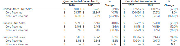 Our United States segment reported a net sales decrease of $47.7 million in 2020 due to a reduction in non-core nicotine revenue of $55.8 million, while core revenue grew by $8.1 million; $7.6 million of which come from growth in our Greenlane house brands. Our Canada segment reported a sales decrease of $6.7 million, and similar to the United Sates the decrease was driven by a $5.0 million decrease in non-core revenue. As for our European reporting segment, annual sales totaled $10.3 million, with Q4 2020 sales totaling $3.1 million and representing a $0.5 million or 15.2% growth in comparison to Q4 2019, the first quarter post acquisition.