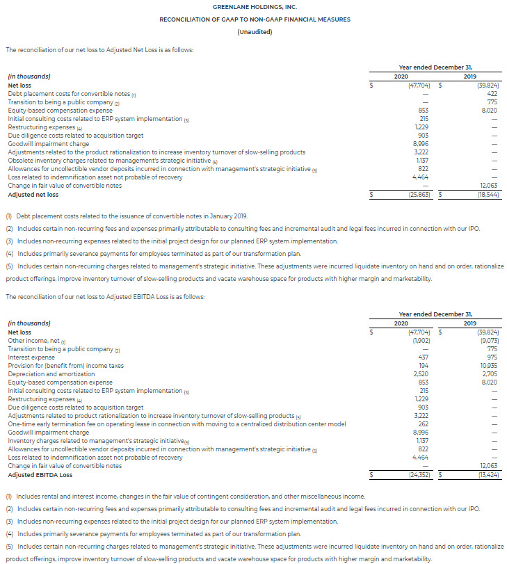 Greenlane discloses Adjusted Net Loss and Adjusted EBITDA, which are non-GAAP financial measures, because management believes these metrics assist investors and analysts in assessing the Company’s overall operating performance and evaluating how well Greenlane is executing its business strategies. You should not consider Adjusted Net Loss or Adjusted EBITDA as alternatives to net loss determined in accordance with GAAP as indicators of Greenlane’s operating performance. Investors are cautioned that there are material limitations associated with the use of non-GAAP financial measures as an analytical tool. Accordingly, you should not view Adjusted Net Loss or Adjusted EBITDA in isolation or as a substitute, or superior to, financial information prepared and presented in accordance with GAAP. Furthermore, these non-GAAP measures may be different from non-GAAP financial measures used by other companies, limiting their usefulness for comparison purposes.