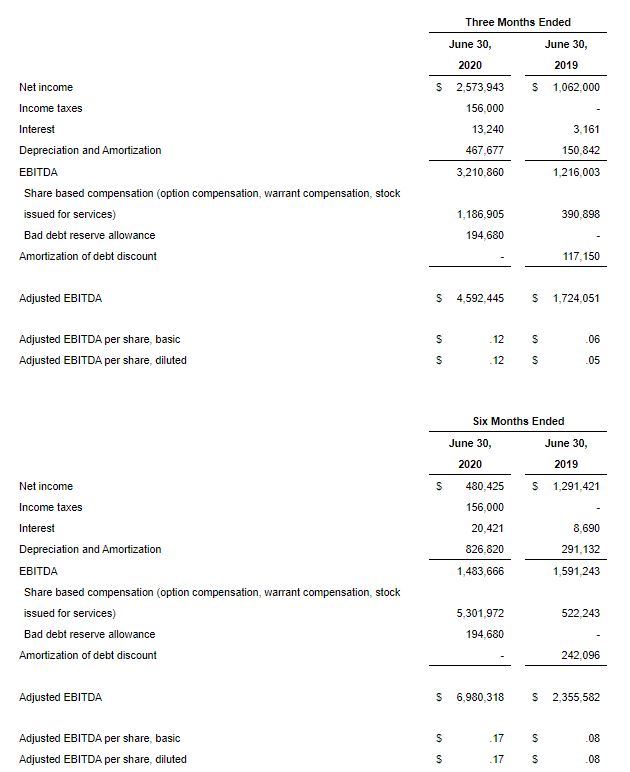 - Adjusted EBITDA of $4.6 million for Q2 2020 vs $1.7 million for Q2 2019, an increase of 166%, $.12 per share, basic