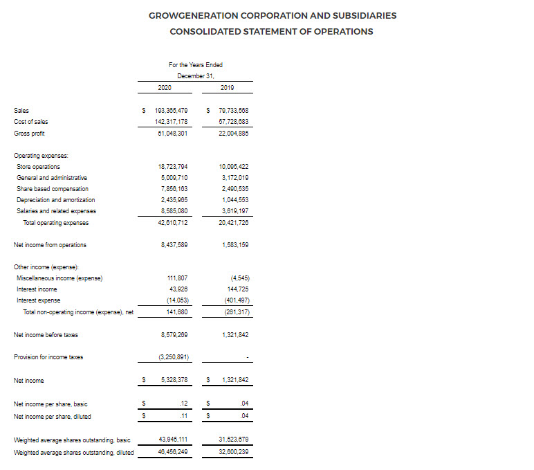 DENVER, March 24, 2021 /PRNewswire/ – GrowGeneration Corp. (NASDAQ: GRWG), (“GrowGen” or the “Company”), the largest chain of specialty hydroponic and organic garden centers, with 52 locations across 12 states, today reported record full-year 2020 revenues of $193.0 million, versus $79.7 million in the same period last year, an increase of 143%. Full-year 2020 adjusted EBITDA of $19.2 million compares to $5.3 million in the same period last year. The Company also reported a record full-year 2020 GAAP pre-tax net income of approximately $8.6 million, compared to pre-tax net income of $1.3 million, in the same period last year. Revenue and adjusted EBITDA guidance for 2021 increases to $415-$430 million, and $48-$51 million, respectively. The Company is providing First Quarter 2021 Revenue and Adjusted EBITDA guidance of $86.0 million – $88.0 million and $9.0 million – $9.5 million, respectively.