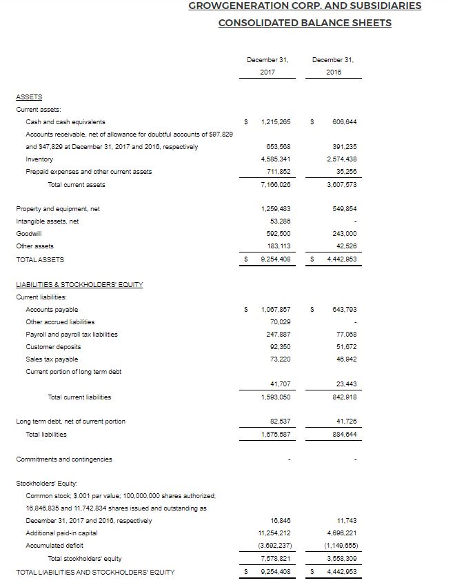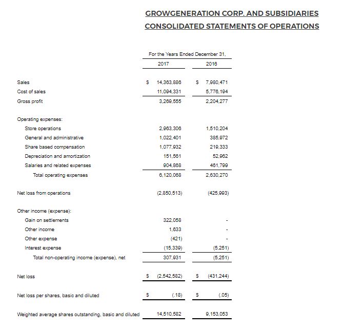 DENVER, March 28, 2018 /PRNewswire/ – GrowGeneration Corp. (OTCQX: GRWG), (“GrowGen” or the “Company”) one of the largest specialty retail hydroponic and organic gardening stores, selling to both the commercial and home cannabis markets, with 15 current locations (13 locations as of December 31, 2017), today reported financial results for its fiscal year ended December 31, 2017.