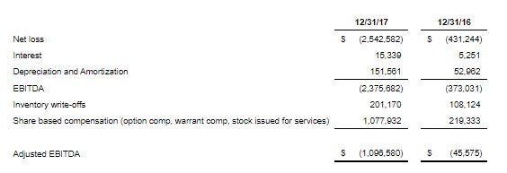 - Adjusted EBITDA for the year ended December 31, 2017 totaled $(1,096,580) compared to adjusted EBITDA of $(45,575) for the year ended December 31, 2016