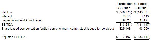 Adjusted EBITDA for the quarter ended June 30, 2017 totaled $7,167 compared to adjusted EBITDA of $(33,447) for the quarter ended June 30, 2016 (see definition and further discussion about the presentation of a EBITDA, a non-GAAP term, below).