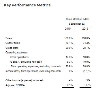 - Store operating costs, as a percentage of revenue, have declined to 12.6% for Q3 2019 compared to 16.8% for Q3 2018.