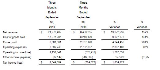 - Net income of $1,049,699 for Q3 2019 compared to a net loss of $(784,573) for Q3 2018, an increase of $1.8 million.