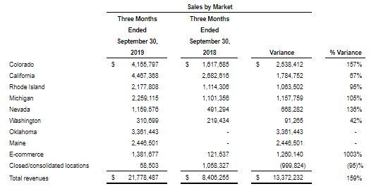 Net revenue for the three months ended September 30, 2019 increased approximately $13.4 million , or 159%, to approximately $21.8 million , compared to approximately $8.4 million for the three months ended September 30, 2018 . The increase in revenues in 2019 was primarily due to 1) the addition of 10 new stores opened or acquired after October 1, 2018 which has sales of $3.9 million in Q3 2019, 2) the acquisition of a new store in mid-July 2018 that had sales of $2.3 million in Q3 2019 compared to sales of $1.6 million in Q3 2018 and 3) the new e-commerce site acquired in mid-September 2018 which had revenues of $1.4 million in Q3 2019 compared to $122,000 in Q3 2018. The Company also had an increase in same store sales comparing Q3 to 2018 to Q3 2019 of $2.7 million as detailed in a chart below. The chart directly below shows sales by market for the three months ended September 30, 2019 and 2018. The Company also consolidated some stores in 2019 and 2018, primarily in Colorado and California that had revenues of $58.000 for the three months ended September 30, 2019 and approximately $1.1 million for the three months ended September 30, 2018 .