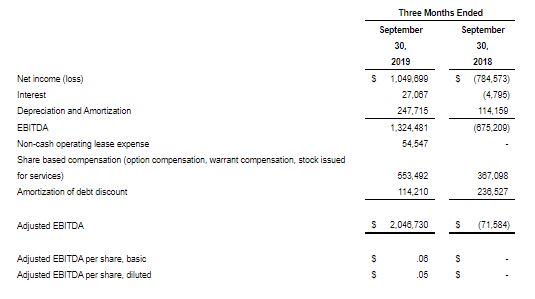 - Adjusted EBITDA of $2,046,730 for Q3 2019 compared to adjusted EBITDA of $(71,584) for Q3 2018, an increase of $2.1 million.