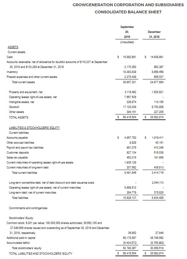 DENVER , Nov. 11, 2019 /PRNewswire/ – GrowGeneration Corp. (OTCQX: GRWG), (“GrowGen” or the “Company”), the largest chain of specialty hydroponic and organic garden centers, with currently 25 locations, today reported financial results for its quarter ended September 30, 2019.