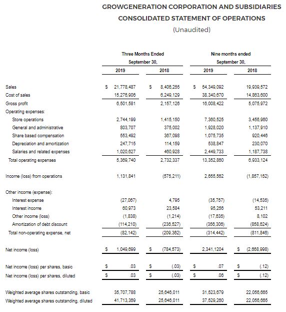 GrowGeneration Reports Record Q3 2019 Revenues and Net Income