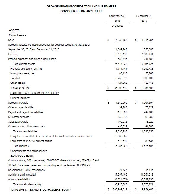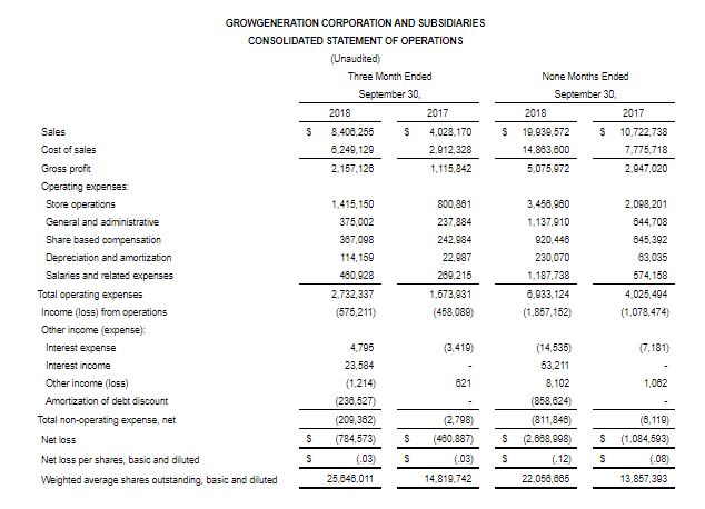 DENVER, Nov. 9, 2018 /PRNewswire/ – GrowGeneration Corp. (OTCQX: GRWG), (“GrowGen” or the “Company”) one of the largest specialty retail hydroponic and organic gardening stores, selling to both the commercial and home cannabis markets, with currently 18 locations, today reported financial results for its 3rd quarter ended September 30, 2018.