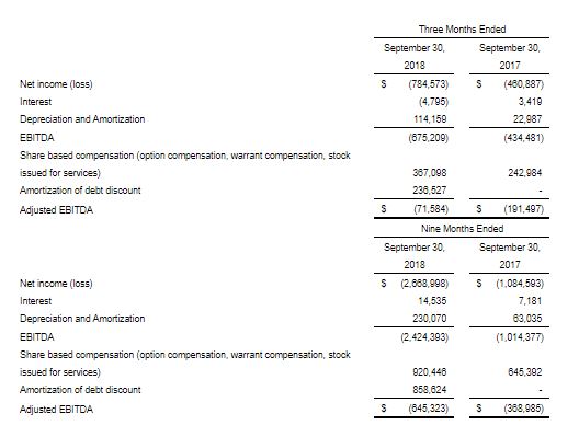 Adjusted EBITDA for the quarter ended September 30, 2018 was $(71,584) compared to adjusted EBITDA of $(191,497) for the quarter ended September 30, 2017 (see definition and further discussion about the presentation of EBITDA, a non-GAAP term, below).