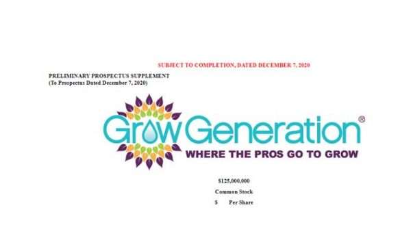 DENVER, CO December 7, 2020 /PRNewswire/ – GrowGeneration Corp. (NASDAQ:GRWG), (“GrowGen” or the “Company”), today announced that it has publicly filed a registration statement on Form S-3 with the U.S. Securities and Exchange Commission relating to a proposed follow-on public offering raising $125,000,000. In connection with the offering, GrowGen expects to grant the underwriters a 30-day option to purchase up to an additional 15% of the shares of common stock offered in the public offering.