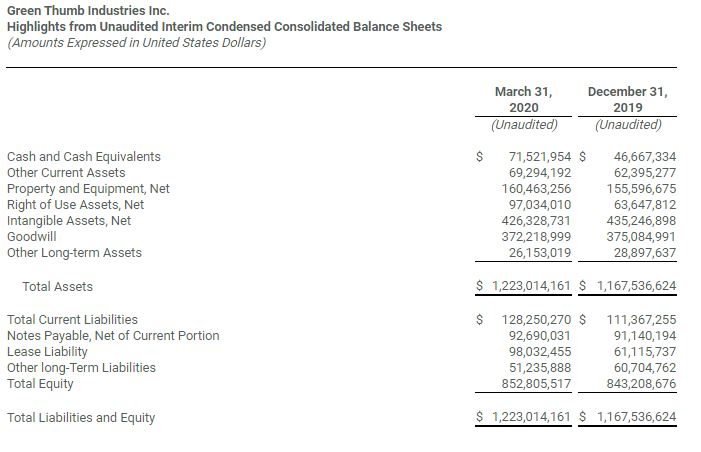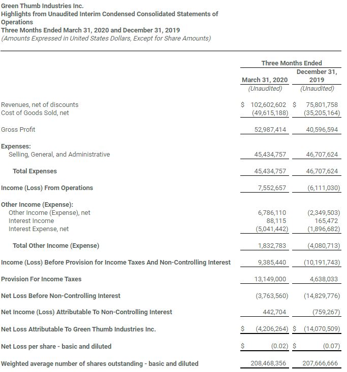- Net Income (Loss) Attributable to Green Thumb: Net loss attributable to the Company for the first quarter 2020 was $4.2 million or ($0.02) per basic and diluted share, as compared to a net loss of $14.1 million or ($0.07) per basic and diluted share for the fourth quarter 2019.