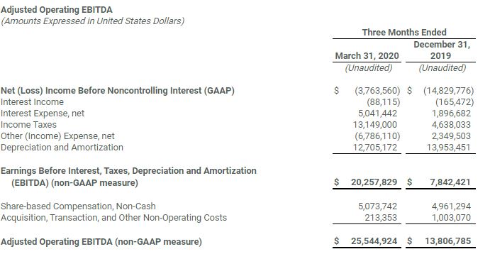 - Adjusted Operating EBITDA: Adjusted Operating EBITDA(1), which is a non-GAAP financial measure as described below and in an accompanying financial table in this release, was $25.5 million for the first quarter 2020, representing an 85% increase from the prior quarter and a 13-fold increase from the first quarter 2019.