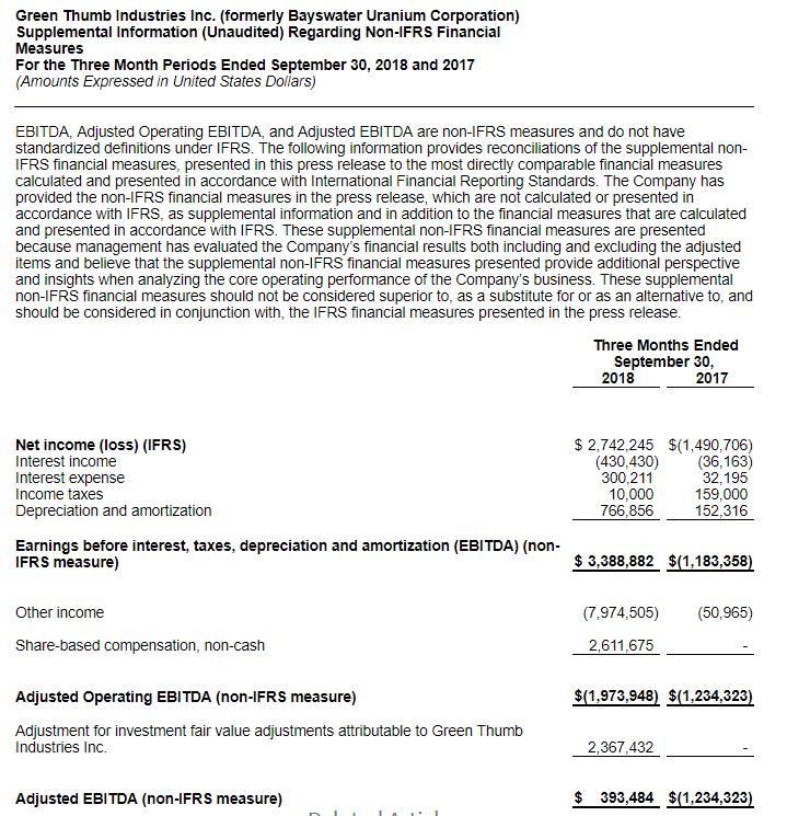 GTI refers to certain non-IFRS financial measures such as Earnings Before Interest, Taxes, Depreciation and Amortization (EBITDA) and adjusted EBITDA earnings defined as earnings before interest, other income, taxes, depreciation, amortization, less certain non-cash equity compensation expense, including one-time transaction fees and all other non-cash items. These measures do not have any standardized meaning prescribed by IFRS and may not be comparable to similar measures presented by other issuers.