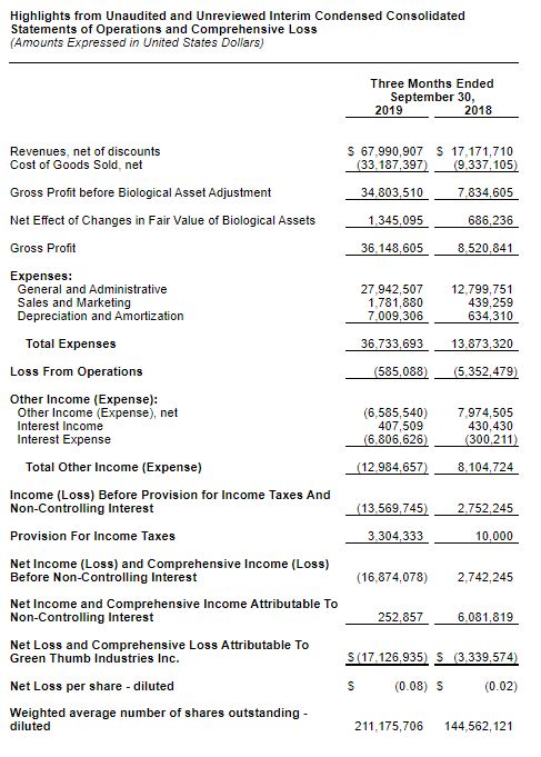 CHICAGO and VANCOUVER, British Columbia, Nov. 20, 2019 (GLOBE NEWSWIRE) — Green Thumb Industries Inc. (“GTI” or the “Company”) (CSE: GTII) (OTCQX: GTBIF), a leading national cannabis consumer packaged goods company and owner of Rise™ and Essence retail stores, today reported its financial results for the third quarter ended September 30, 2019. All currency is in U.S. dollars, unless noted otherwise.