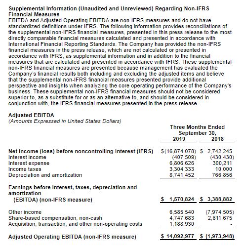 GTI generated Adjusted Operating EBITDA¹ of $14.1 million, or 20.7% of revenue, for the third quarter of 2019 as compared to $5.0 million, or 11.3% of revenue, in the prior quarter. EBITDA¹ was $1.6 million for the third quarter of 2019 as compared to a loss of $9.4 million in the prior quarter. Net loss attributable to GTI for the third quarter was $17.1 million.