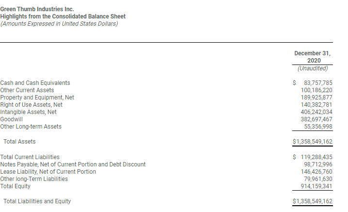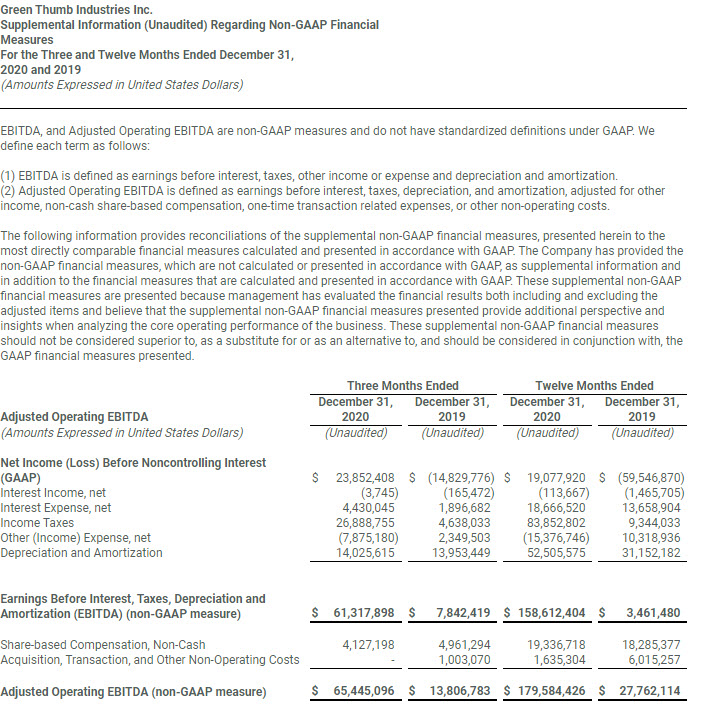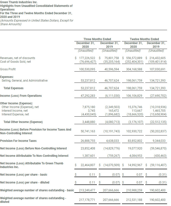 “This was a solid quarter to top off a milestone year for the Green Thumb team. In the fourth quarter, we delivered substantial revenue growth, expanded gross margins, recorded our fourth consecutive quarter of improved operating leverage and achieved positive GAAP net income and EPS for the second quarter in a row. The entire Green Thumb team should be proud of these full year 2020 numbers: $557 million of revenue, $180 million of Adjusted EBITDA, $15 million of GAAP net income, 7 cents a share of GAAP EPS and over $95 million in cash flow from operations,” said Green Thumb Chairman, Founder and Chief Executive Officer Ben Kovler.