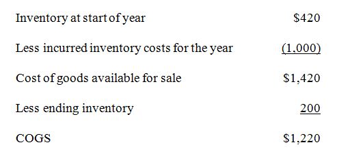 California Recreational Cannabis, Inc. (“Cal Can”) started the fiscal year with $420 worth of inventory. Cal Can reasonably capitalized a portion of that year’s rent, labor, equipment, maintenance cost, advertising, and ad valorem tax on inventory, among other things, towards selling the inventory on hand. These costs added up to $1,000. Cal Can sold $220 of the inventory throughout the year and $200 worth of inventory remained. Cal Can has $1,220 of COGS for the year that it can subtract from gross income.