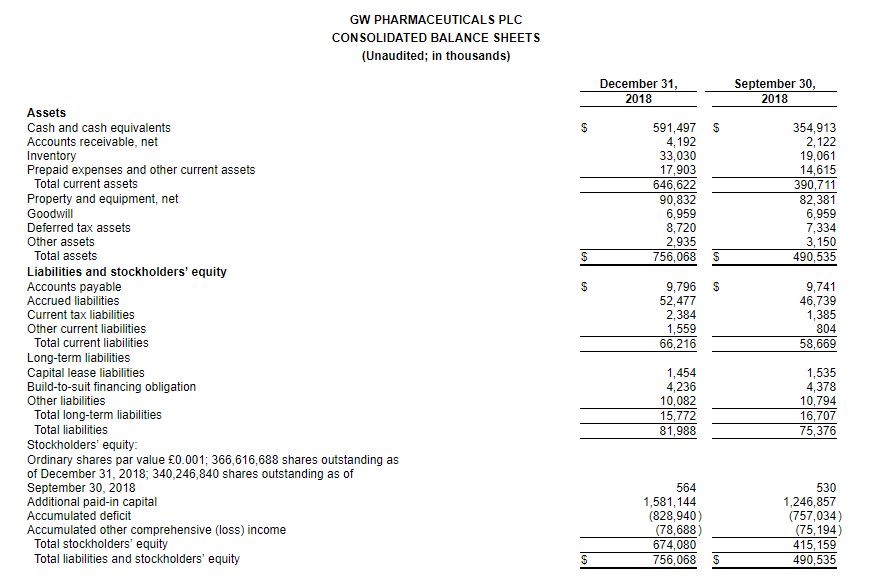 LONDON and CARLSBAD, Calif., Feb. 26, 2019 (GLOBE NEWSWIRE) — GW Pharmaceuticals plc (NASDAQ: GWPH, GW, the Company or the Group), the world leader in the development and commercialization of cannabinoid prescription medicines, announces financial results for the quarter ended December 31, 2018.