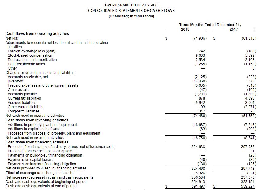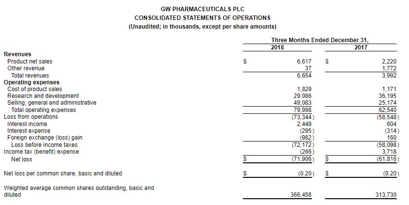 GW Pharmaceuticals plc Reports Financial Results and Operational Progress for the Quarter Ended December 31, 2018