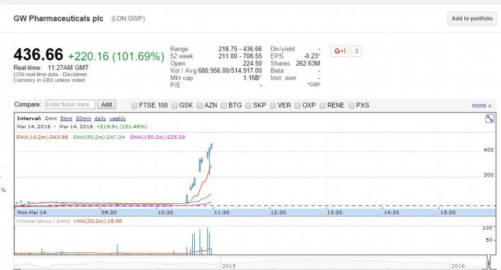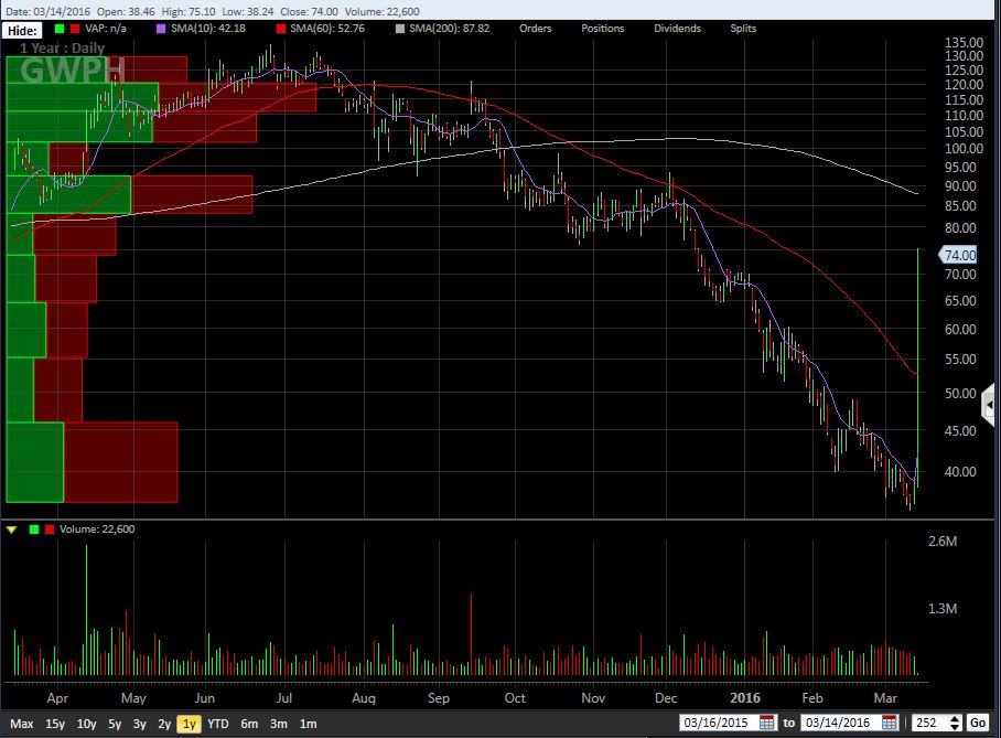 GWP is the UK listing, and the formula for converting to GWPH on the NASDAQ is to take the price in pounds (4.3666), multiply by 12 (each ADS in the U.S. represents 12 shares in the UK) and then to adjust for the currency, which is 1.4357. This yields a price of $75.23. At the time of this writing, the price was approximately $74, with 21K shares having traded. GWPH closed at $38.46 on Friday.