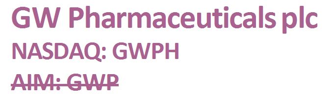 London, UK, October 19 2016: GW Pharmaceuticals plc (Nasdaq: GWPH, AIM: GWP, “GW” or “the Company”), a biopharmaceutical company focused on discovering, developing and commercializing novel therapeutics from its proprietary cannabinoid product platform, today announced the Company’s intention to cancel the admission of its 0.1 pence ordinary shares (Ordinary Shares) to trading on AIM on 5 December, 2016. The last day of trading on AIM will be 2 December, 2016. GW will retain its U.S. listing on the NASDAQ Stock Exchange of American Depositary Receipts (ADRs) under ticker symbol GWPH. Existing holders of ADRs do not need to take any action as a result of this announcement.
