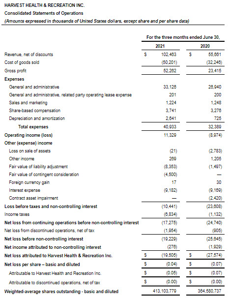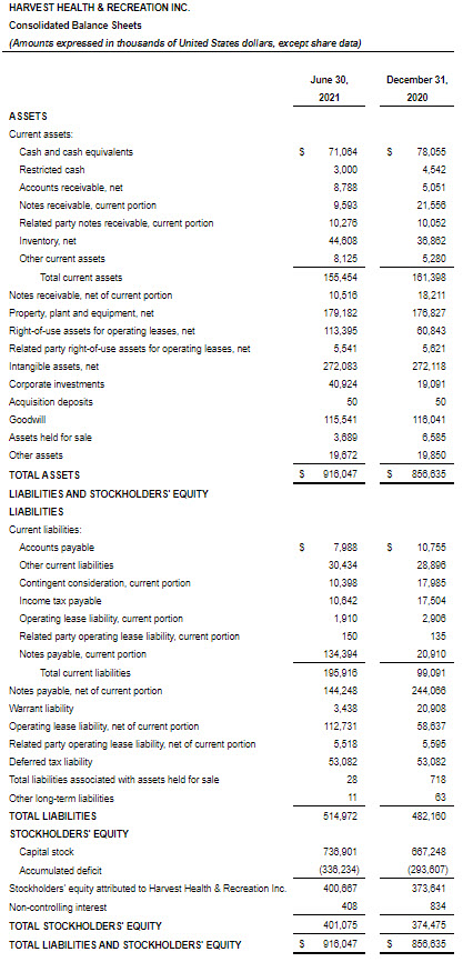 Harvest Health & Recreation Inc. Reports Second Quarter 2021 Financial Results