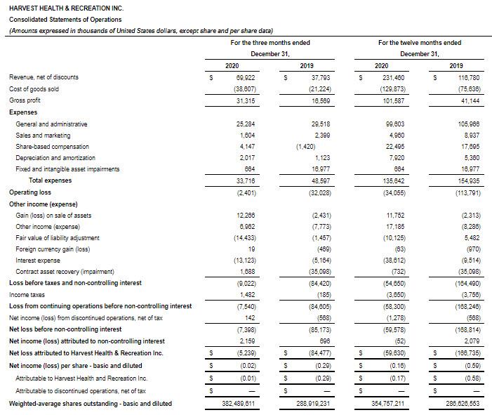 PHOENIX, March 30, 2021 /PRNewswire/ — Harvest Health & Recreation Inc. (“Harvest” or the “Company”) (CSE: HARV,OTCQX: HRVSF), a vertically integrated cannabis company and multi-state operator in the U.S., today reported its financial and operating results for the fourth quarter and year ended 2020. All financial information is provided in U.S. dollars unless otherwise indicated.