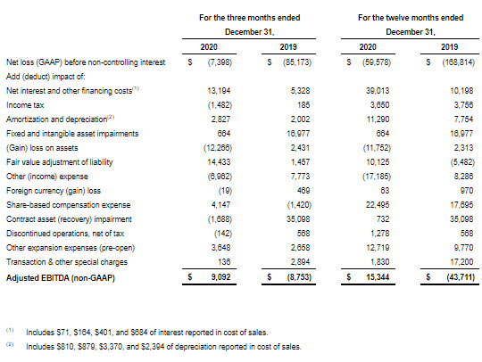 - Adjusted EBITDA in the fourth quarter was $9.1 million, compared to ($8.8) million in the fourth quarter of 2019 and $11.5 million in the third quarter of 2020. Adjusted EBITDA for the full year was $15.3 million compared to ($43.7) million in 2019.
