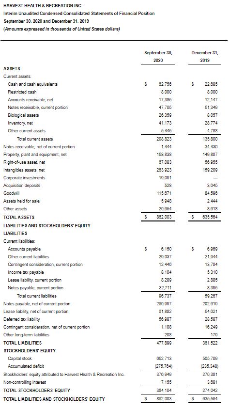 Harvest Health & Recreation Inc. Reports Third Quarter 2020 Financial Results