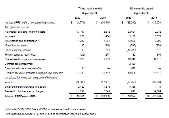 - Adjusted EBITDA excluding biological adjustments in the third quarter was $10.5 million, compared to ($10.9) million in the third quarter of 2019 and $4.1 million in the second quarter of 2020.