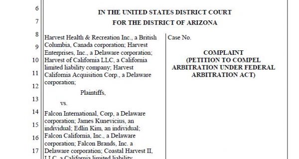 On January 7th, Harvest Health & Recreation (CSE: HARV) (OTC: HRVSF) revealed that it has filed a lawsuit against Falcon International seeking to terminate its merger that was announced in early 2019 and the return of money paid to the company thus far. The lawsuit, which was filed in the U.S. Federal Court in Arizona, suggests that Falcon’s principals stalled due to the falling share price of Harvest. Additionally, Harvest alleges that Falcon International engaged in illegal activities.
