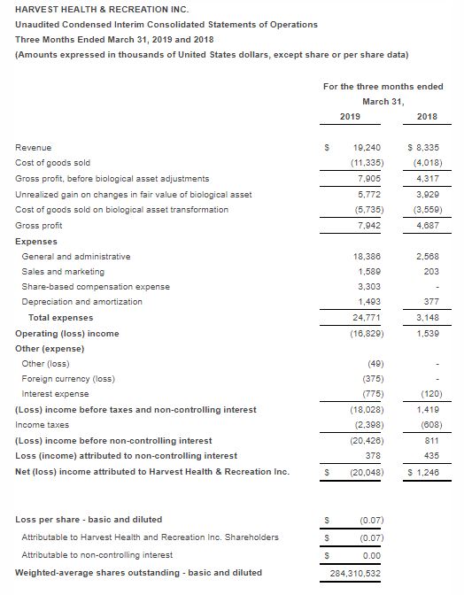 Harvest Health & Recreation, Inc. Reports First Quarter 2019 Financial Results