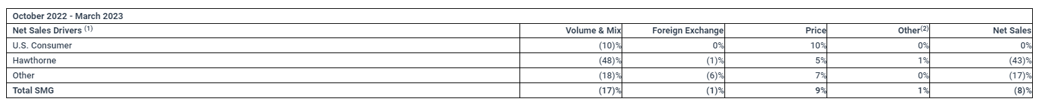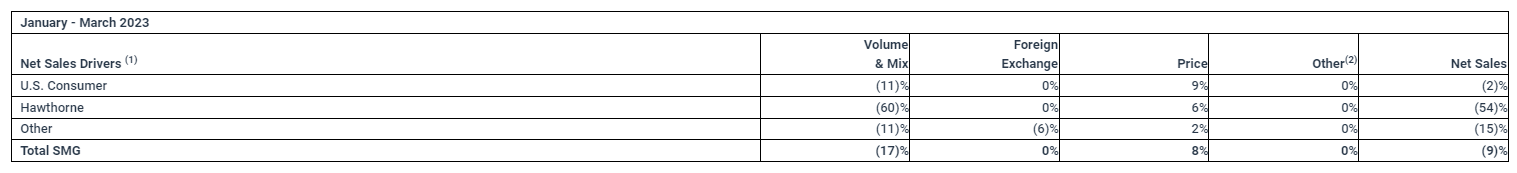 For the quarter ended April 1, 2023, company-wide sales decreased 9 percent to $1.53 billion. U.S. Consumer segment sales decreased 2 percent to $1.36 billion, from a record $1.38 billion last year. Hawthorne segment sales decreased 54 percent to $93 million, compared with $203 million during the same period a year ago, reflecting the continued challenges in the hydroponic industry.
