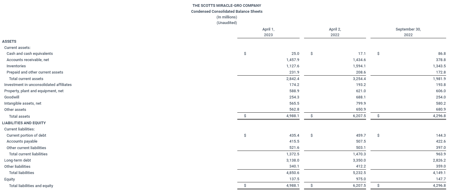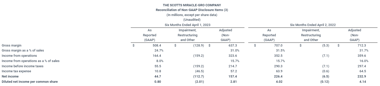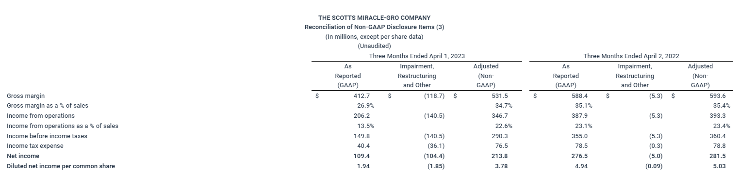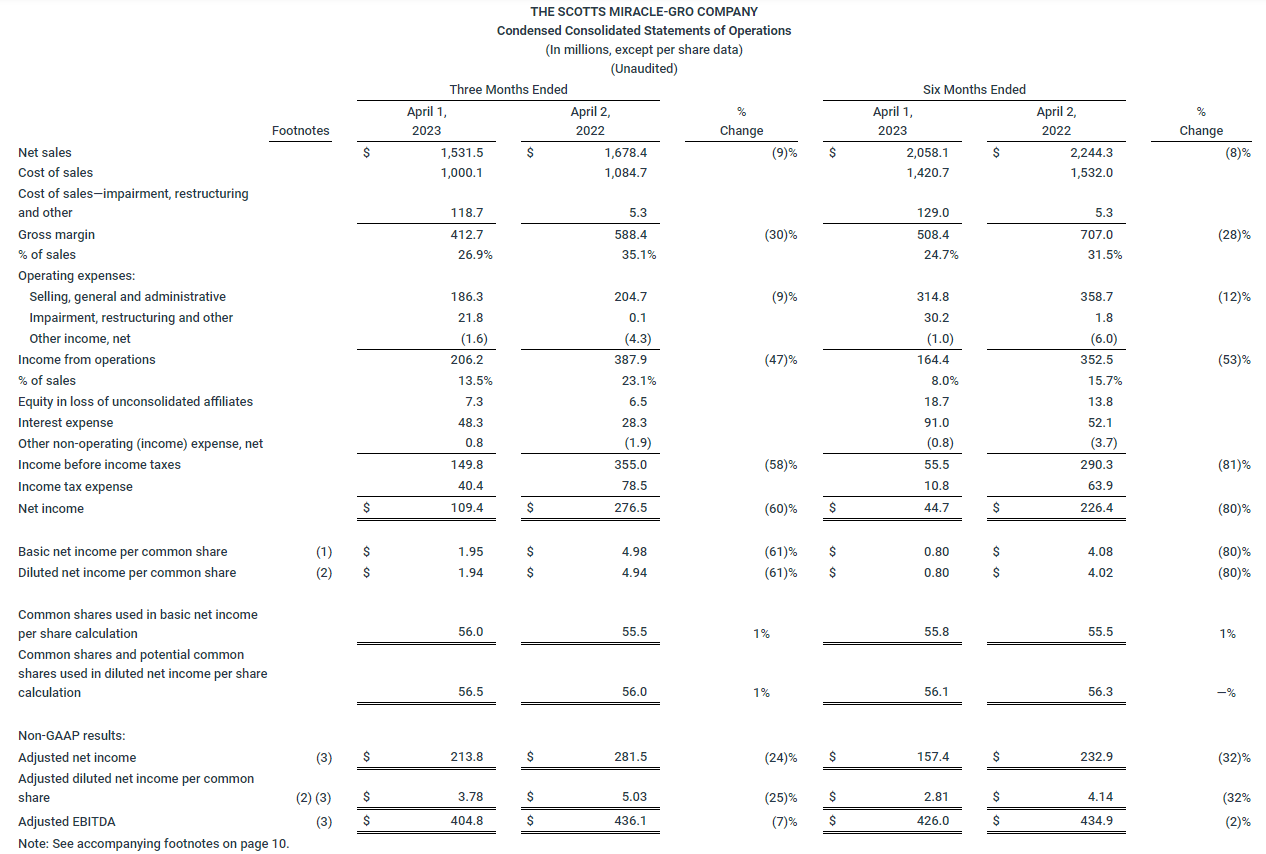 MARYSVILLE, Ohio, May 03, 2023 (GLOBE NEWSWIRE) — The Scotts Miracle-Gro Company (NYSE: SMG), the world’s leading marketer of branded consumer lawn and garden as well as indoor and hydroponic growing products, today announced results for its fiscal second quarter ended April 1, 2023.