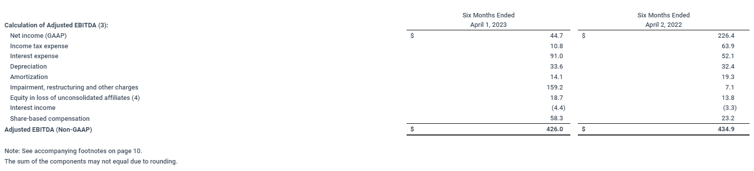 For the three and six months ended April 1, 2023, the following items were adjusted, in accordance with the definitions above, to arrive at the non-GAAP financial measures: