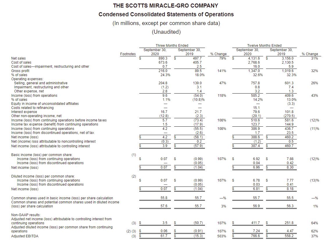 MARYSVILLE, Ohio, Nov. 04, 2020 (GLOBE NEWSWIRE) — The Scotts Miracle-Gro Company (NYSE: SMG), the world’s leading marketer of branded consumer lawn and garden as well as indoor and hydroponic growing products, today released record fiscal fourth quarter and full year financial results that were driven by the continued strength of both its U.S. Consumer and Hawthorne reporting segments.