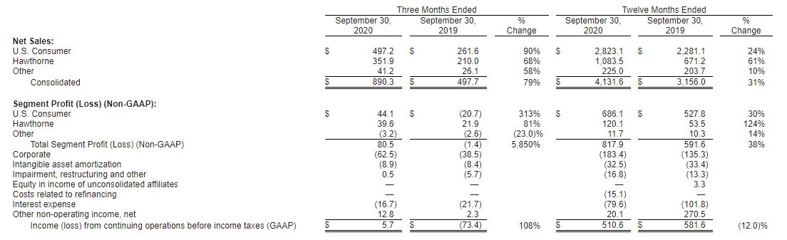 Company-wide sales increased 79 percent to $890.3 million. U.S. Consumer increased 90 percent to $497.2 million from $261.6 million. Hawthorne sales increased 68 percent to $351.9 million compared with $210.0 million. The increase in both segments was across all product categories, geographies and retail channels.