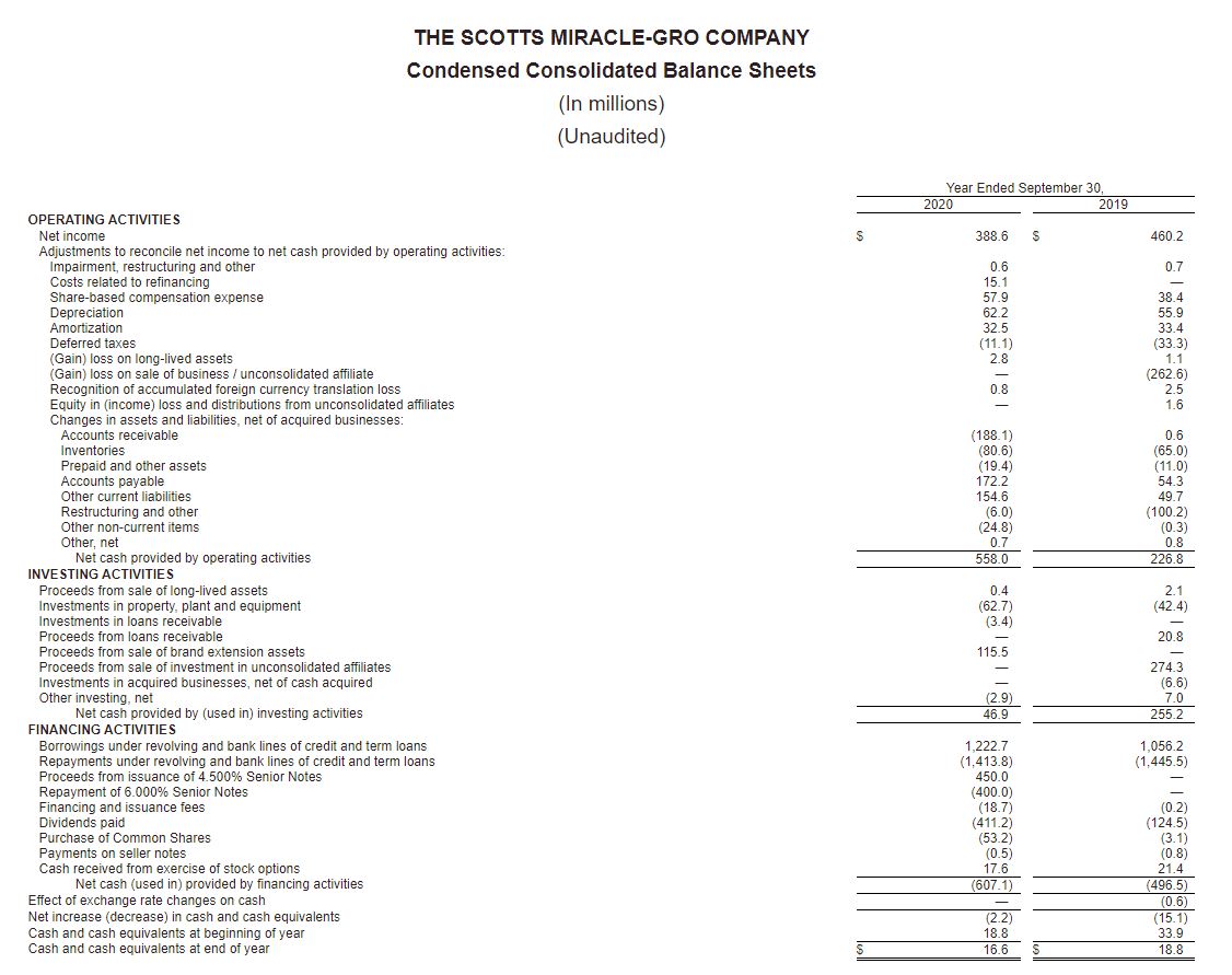 (5) For the twelve months ended September 30, 2019, net cash provided by operating activities and free cash flow include cash tax payments associated with the disposition of the TruGreen Joint Venture of approximately $100.0 million and payments made in connection with previously disclosed litigation settlements related to legal matters In re Scotts Litigation and In re Morning Song Bird Food Litigation, net of insurance reimbursements and taxes, of approximately $45.0 million.