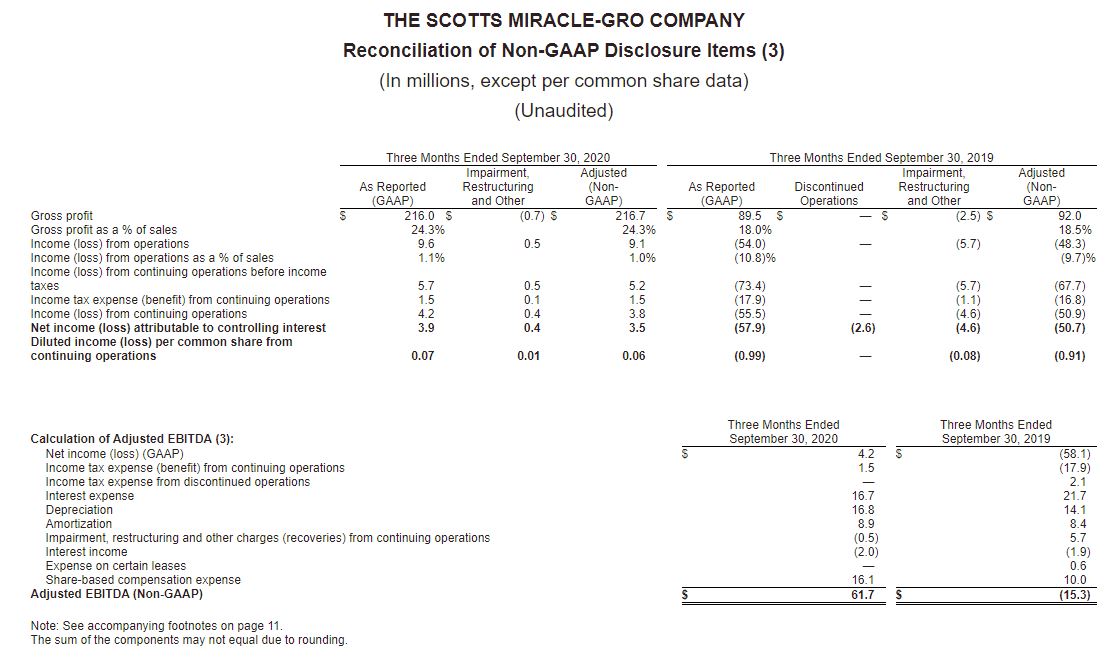 • The Company recognized a favorable adjustment of zero and $0.4 million related to the previously disclosed legal matter In re Scotts EZ Seed Litigation during the three and twelve months ended September 30, 2019, respectively, in the “Impairment, restructuring and other” line in the Condensed Consolidated Statements of Operations.