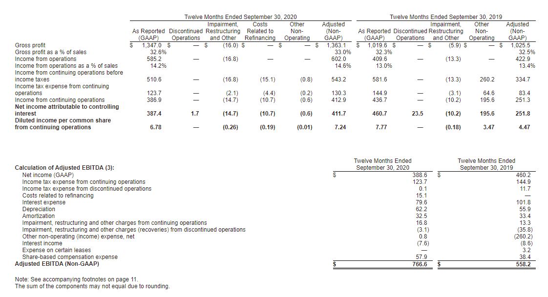 For the year ended September 30, 2020, company-wide sales increased 31 percent to a record $4.13 billion, compared with $3.16 billion a year earlier. GAAP earnings from continuing operations were $6.78 per diluted share, compared with $7.77 per share in the prior year. Non-GAAP adjusted earnings, which are the basis of the Company’s guidance and exclude impairment, restructuring, and other one-time items, were $7.24 per share compared with $4.47 per share a year ago.