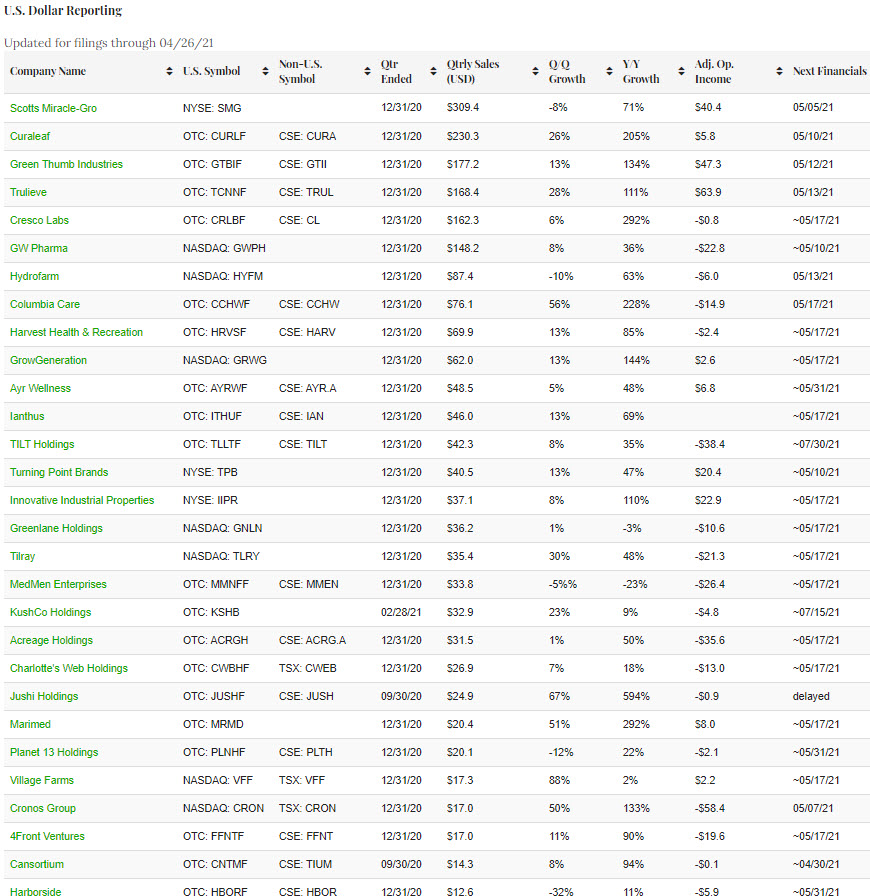 The Public Cannabis Company Revenue & Income Tracker, managed by New Cannabis Ventures, ranks the top revenue producing cannabis stocks that generate industry sales of more than US$12.5 million per quarter (C$15.5 million). This data-driven, fact-based tracker will continually update based on new financial filings so that readers can stay up to date. Companies must file with the SEC or SEDAR and be current to be considered for inclusion. Please note that we have raised the minimum quarterly revenue several times as the industry has scaled up, including from US$10.0 million in November 2020, US$7.5 million in June 2020, US$5.0 million in October 2019 and US$2.5 million in May 2019.