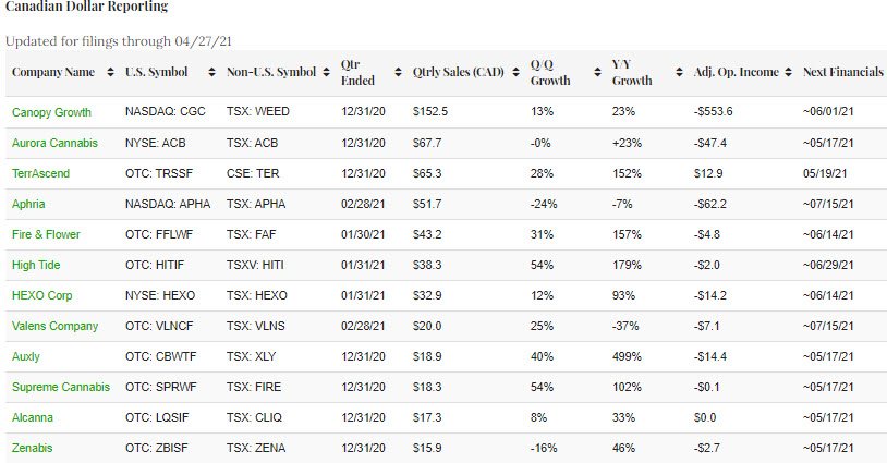 Canadian Dollar Reporting – Public Cannabis Company Revenue Tracker