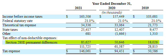 Trulieve shared a very interesting table in its 10-K annual report filing detailing its provision for federal taxes. In the past, it had posted its tax provision and had mentioned how IRC Section 280E has an impact. For those not familiar with 280E, it is a federal statute that disqualifies all expenses beyond cost of goods sold for businesses involved in trafficking of Schedule I or II substances that was created in the 1980s. The result is that state-legal cannabis operators have extremely high federal income tax rates.