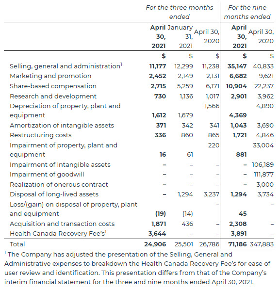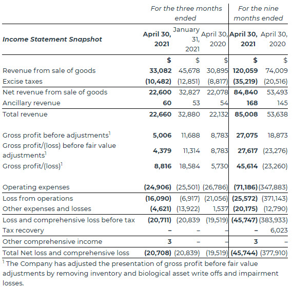 In this press release, reference is made to gross profit before adjustment, profit/margin before fair value adjustments, adjusted gross profit/margin, adjusted EBITDA, and revenue per gram equivalent which are not measures of financial performance under International Financial Reporting Standards (IFRS). These metrics and measures are not recognized measures under IFRS, do not have meanings prescribed under IFRS and are as a result unlikely to be comparable to similar measures presented by other companies. These measures are provided as information complementary to those IFRS measures by providing a further understanding of our operating results from the perspective of management. As such, these measures should not be considered in isolation or in lieu of a review of our financial information reported under IFRS. Definitions and reconciliations for all terms above can be found in the Company’s Management’s Discussion and Analysis for the three and nine months ended June 14, 2021, filed under the Company’s profile on SEDAR at www.sedar.com and EDGAR at www.sec.gov respectively