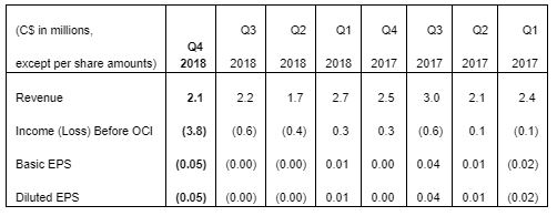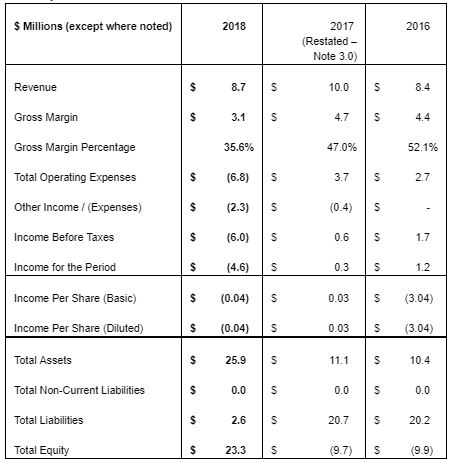 - Gross margin in fiscal 2018 was $3,109,689 (2017 – $4,707,750), which declined primarily due to adjustments for the valuation of inventory made in preparation for the Company’s warehouse relocation that occurred in early 2019.