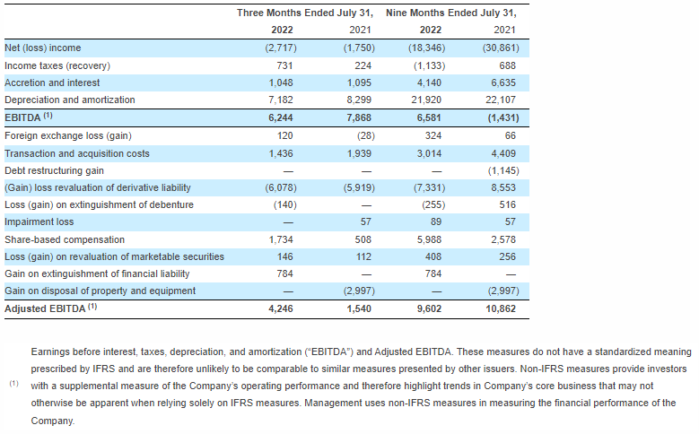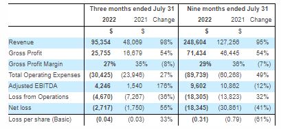 - Adjusted EBITDA¹ for the three months ended July 31, 2022, was $4.2 million compared to $1.5 million for the same quarter last year, representing an increase of 176%. Sequentially, Adjusted EBITDA increased by 77% compared to $2.4 million during the previous quarter
